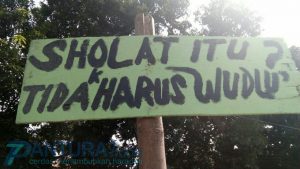 Selain plang bertuliskan ‘sholat tidak perlu whudu’, Rido’i juga memasang plang bertuliskan sejumlah kalimat nyeleneh, diantaranya berbunyi ‘PROBOLINGGO ingin bahagia sejahtera dunia akherat, kuncinya islam iman ihsan. Yang lain nooo’.