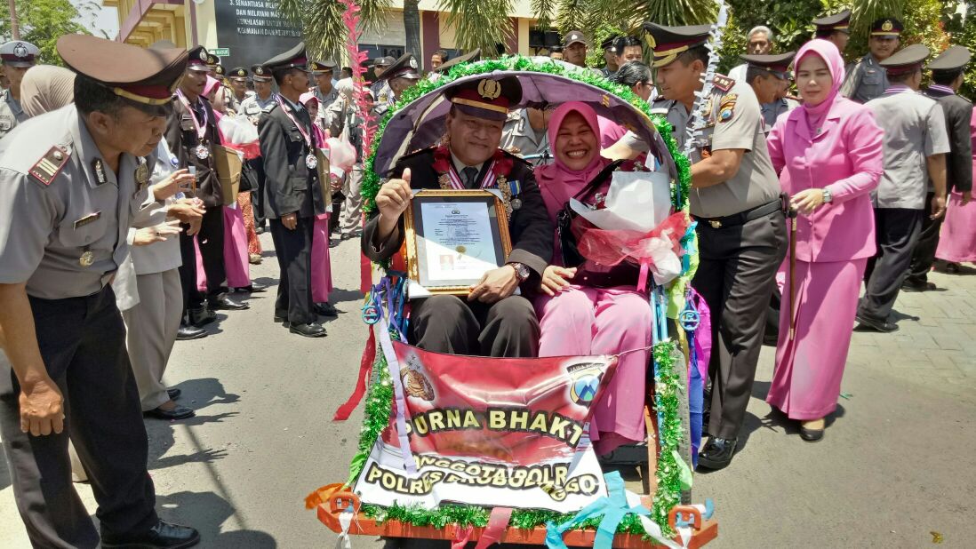 Seusai upacara purna tugas, 17 anggota itu melewati pedang pora dan selanjutnya menaiki becak hias yang dikayuh oleh Kapolres Probolinggo, Waka Polres serta dan Perwira lainnya. Mereka diarak berkeliling halaman Mapolres. (em/ela).